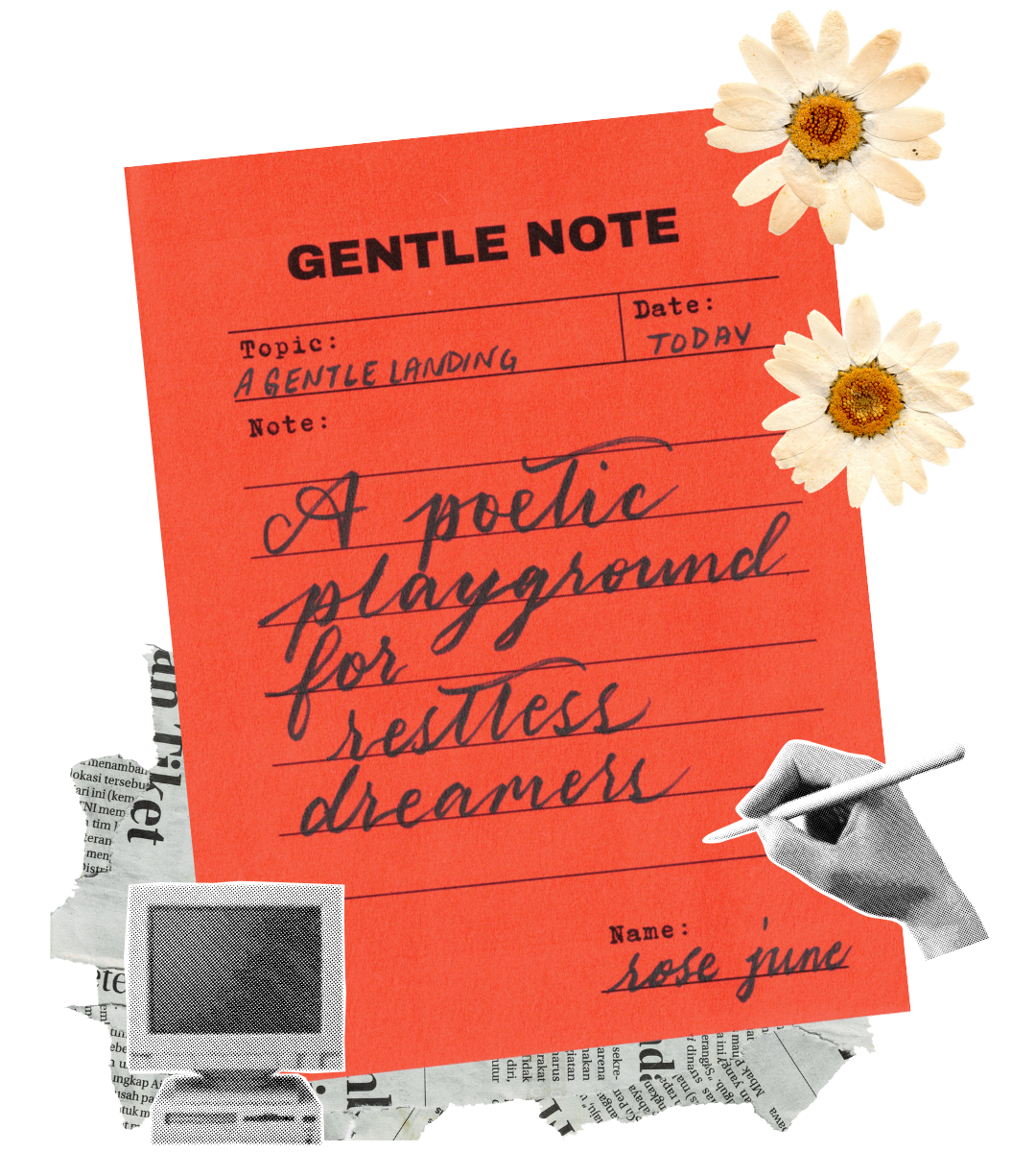 My name is rose june (she/her),1 and this newsletter is a where I share my dreams for what âa gentle landingâ looks like. My main mission in life is to rest, heal, and play. Here, I invite others to do the same, with a poetic approach to spiritual formation and contemplative life.