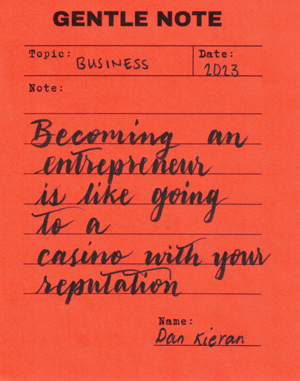 I read a quote that said “Being an entrepreneur is like going to a casino with your reputation.” I had to put that in calligraphy. It feels so true—I am sticking my neck out here, trying my best to build a foundation I can build my dreams on.
