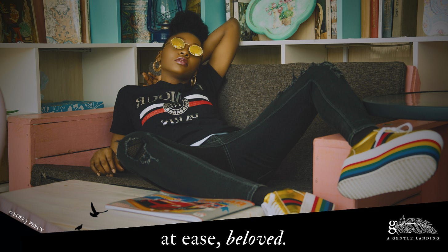 I hope to speak truth that helps us gather ourselves. A Gentle Landing does not have to arrive at tidy, all-encompassing, resolutions. I am always arriving and taking my time to stand after I have been laying down for awhile. I crack my joints, yawn, and stretch and I hope, as you are able, you can too. May these practices guide your stretch into your full humanity and lean into the ordinary everydayness of queer celebration.16