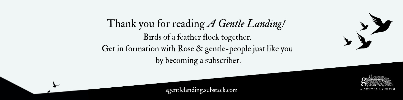 ![“I have gentle landing dreams. I keep seeing them even when my eyes are opened.” a quote from Rose J. Percy. Buy me a feather to support my gentle landing dreams. [the background image is classic for the newsletter border at the bottom that is angled in the left is two birds, one perched and one flying. There's an image of a hand off to the right, holding a gentle landing logo—with a feather attached—in the form of a token.] “I have gentle landing dreams. I keep seeing them even when my eyes are opened.” a quote from Rose J. Percy. Buy me a feather to support my gentle landing dreams. [the background image is classic for the newsletter border at the bottom that is angled in the left is two birds, one perched and one flying. There's an image of a hand off to the right, holding a gentle landing logo—with a feather attached—in the form of a token.]](https://substackcdn.com/image/fetch/$s_!T77n!,w_1456,c_limit,f_auto,q_auto:good,fl_progressive:steep/https%3A%2F%2Fsubstack-post-media.s3.amazonaws.com%2Fpublic%2Fimages%2F018cf17d-7736-4a39-86de-e2064a6cd2ed_1584x396.png)