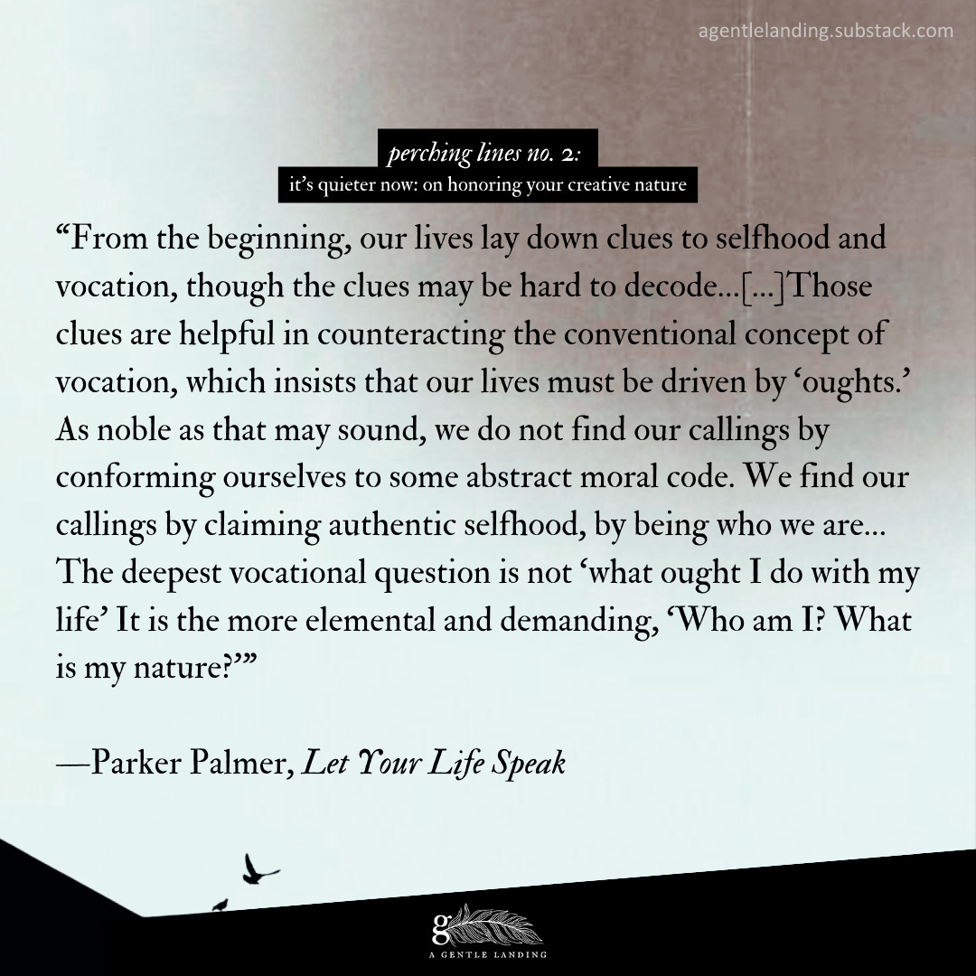 Recently I was reminded that part of my vision for A Gentle Landing includes nurturing creative energy.1 I hope these “perching lines” continue to foster creative rest and reflection for you all!