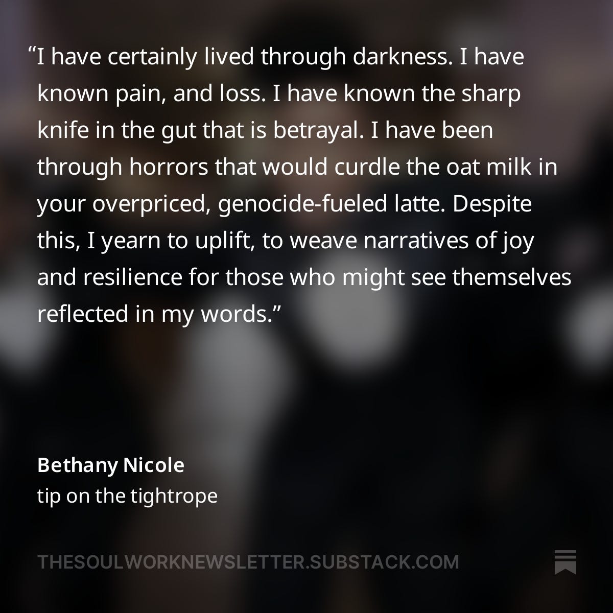 Need I say more? I am trying not to overextend myself in this season and appreciated this reminder. A post of his I loved recently was a reflection on the “seat of Toni,” and the work of EbonyJanice in All the Black Girls Are Activists. But we perch on the lines for that one soon in “I could care less, pt. 3.”