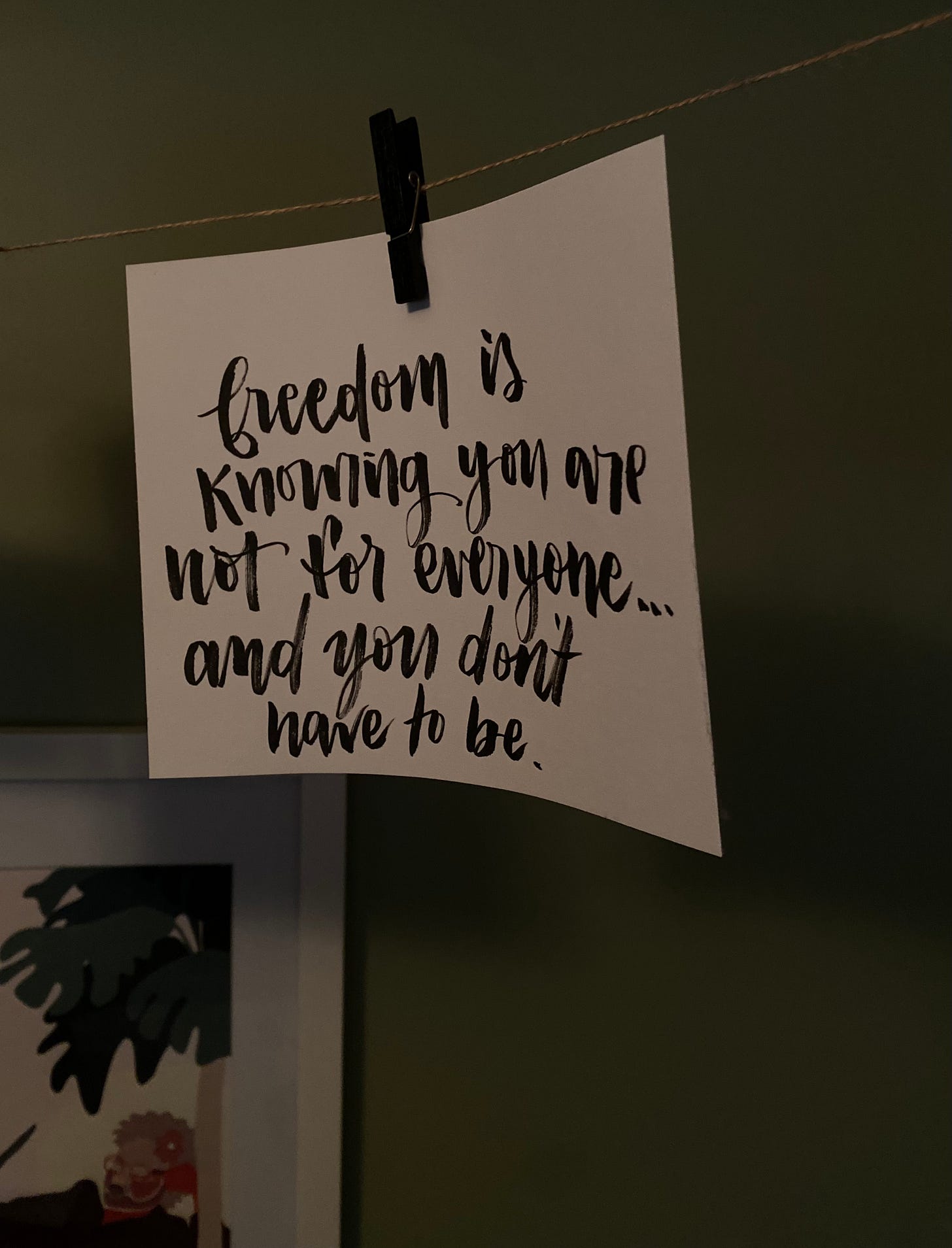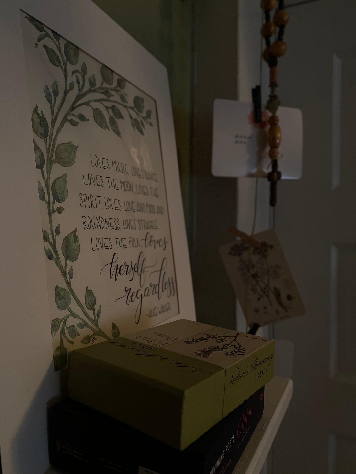 , made this beautiful artwork below for me. It is the last thing I see before I leave my room on my way out to places that may or may not receive me well. Read the whole thing here. [In front is a deck of the Lucille Clifton “Divining Poets” oracle deck and a deck of “Nature’s Pharmacy” cards. I try as often as I can to change the ones on display so that I'm always thinking about her poetry and always learning a little something new about the curative power of plants.]“Freedom is knowing you are not for everyone…and you don’t have to be.”