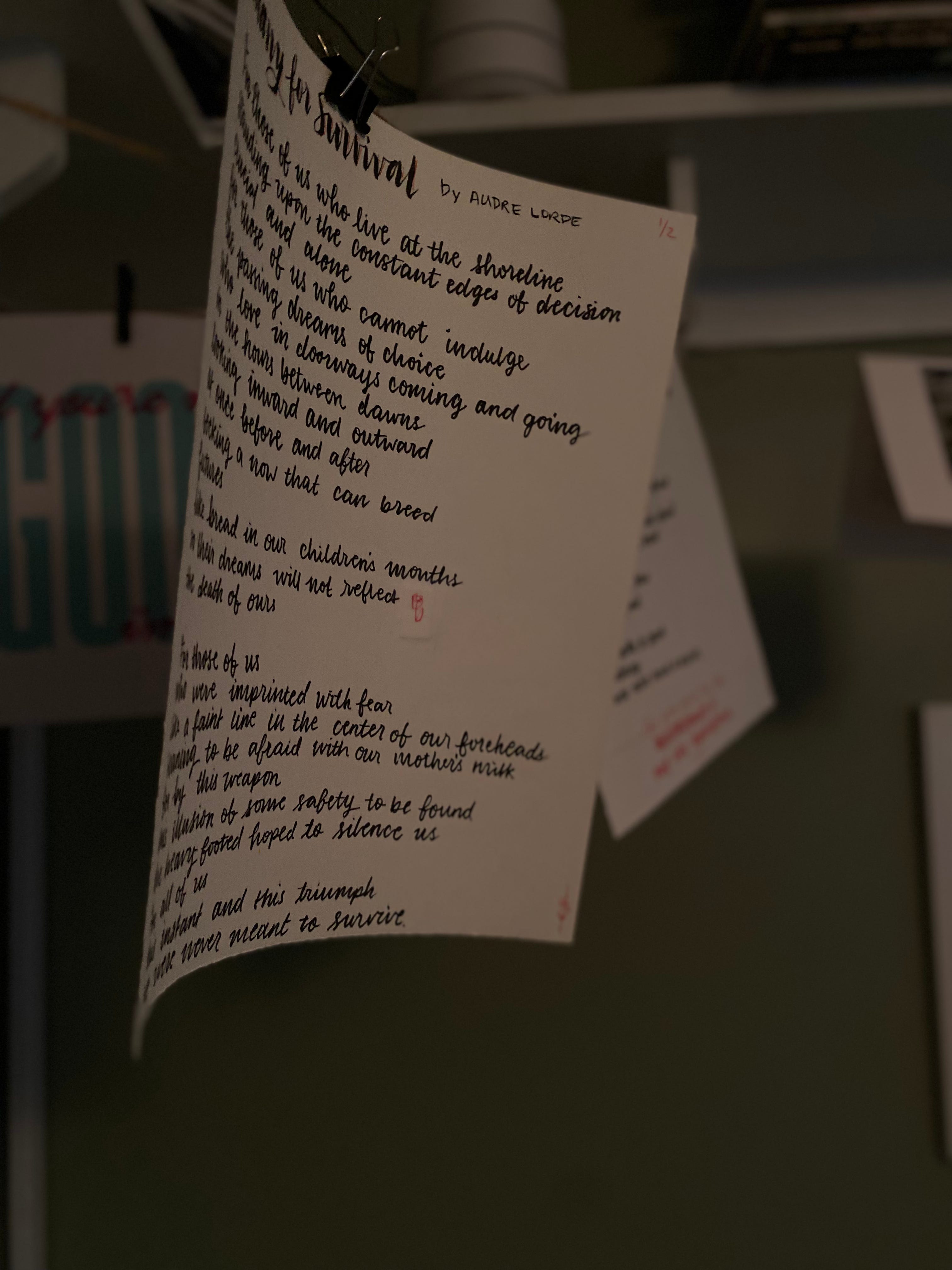 When I say perch, I mean perch. I hung some twine. I used some clothes pins. I thought about how much slack to leave in order to avoid accidents. I recognize some of these may fall at some point, as lines often do. But when I am just a little bit lost on my way to doing the work in the way Maya describes in Black Women Writers at Work, these reminders bring me back.